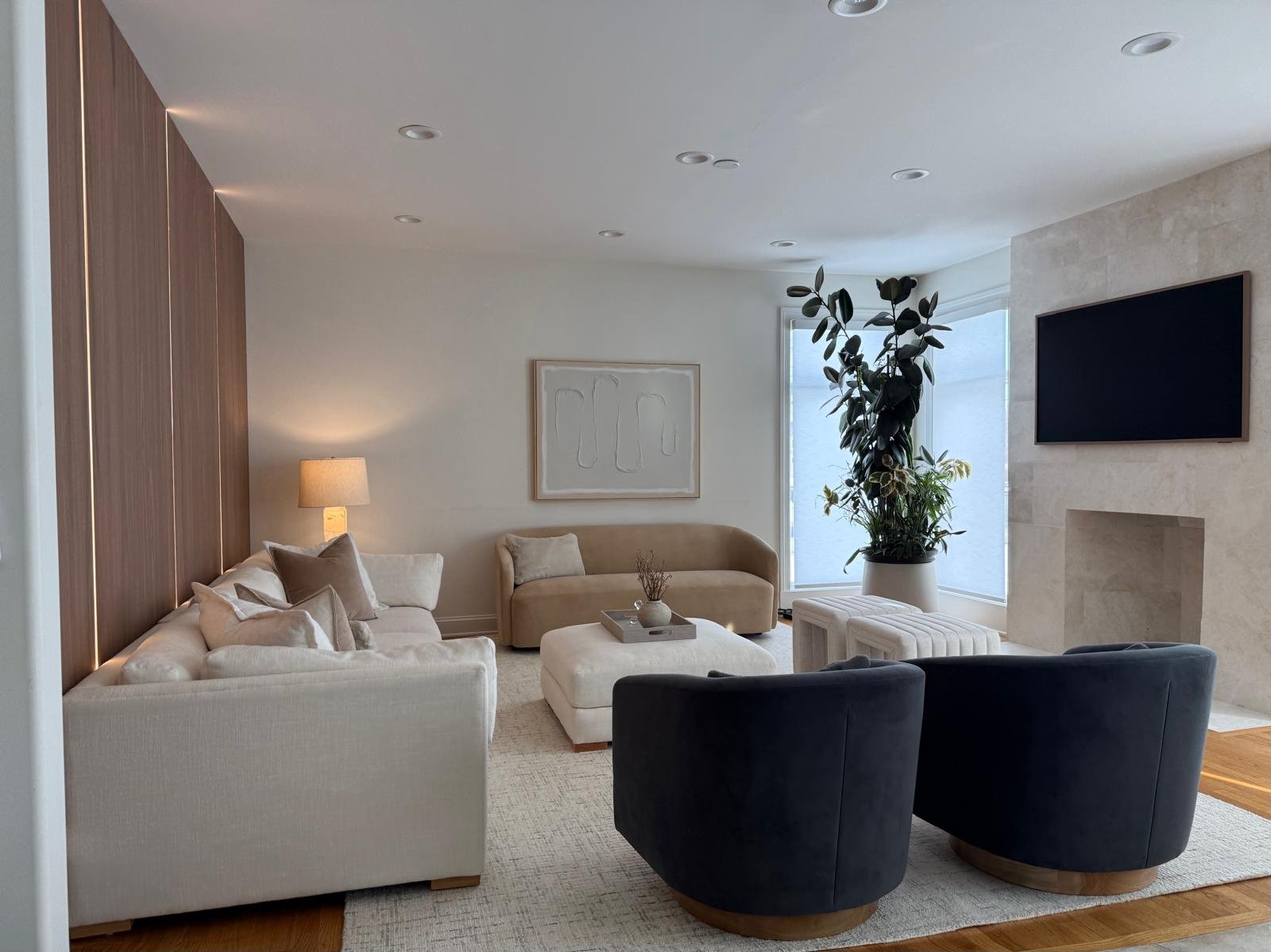For this project, the clients envisioned a modern family room with a refined, hotel-lobby vibe. Their existing sofa was the main piece we needed to work around, so the design was thoughtfully built to complement and elevate what they already owned. The biggest challenge was working with two large empty walls while making sure nothing distracted from the true focal point, the fireplace, TV, and window wall. To keep the space balanced and serene, we added a subtle, nature, inspired artwork to one wall for softness and warmth. On the opposite wall, we installed custom walnut panels with integrated LED lighting to create a clean, architectural moment that feels luxurious without overwhelming the room. These thoughtful additions completed the space and brought in that elevated, hotel-like atmosphere the clients were dreaming of.
